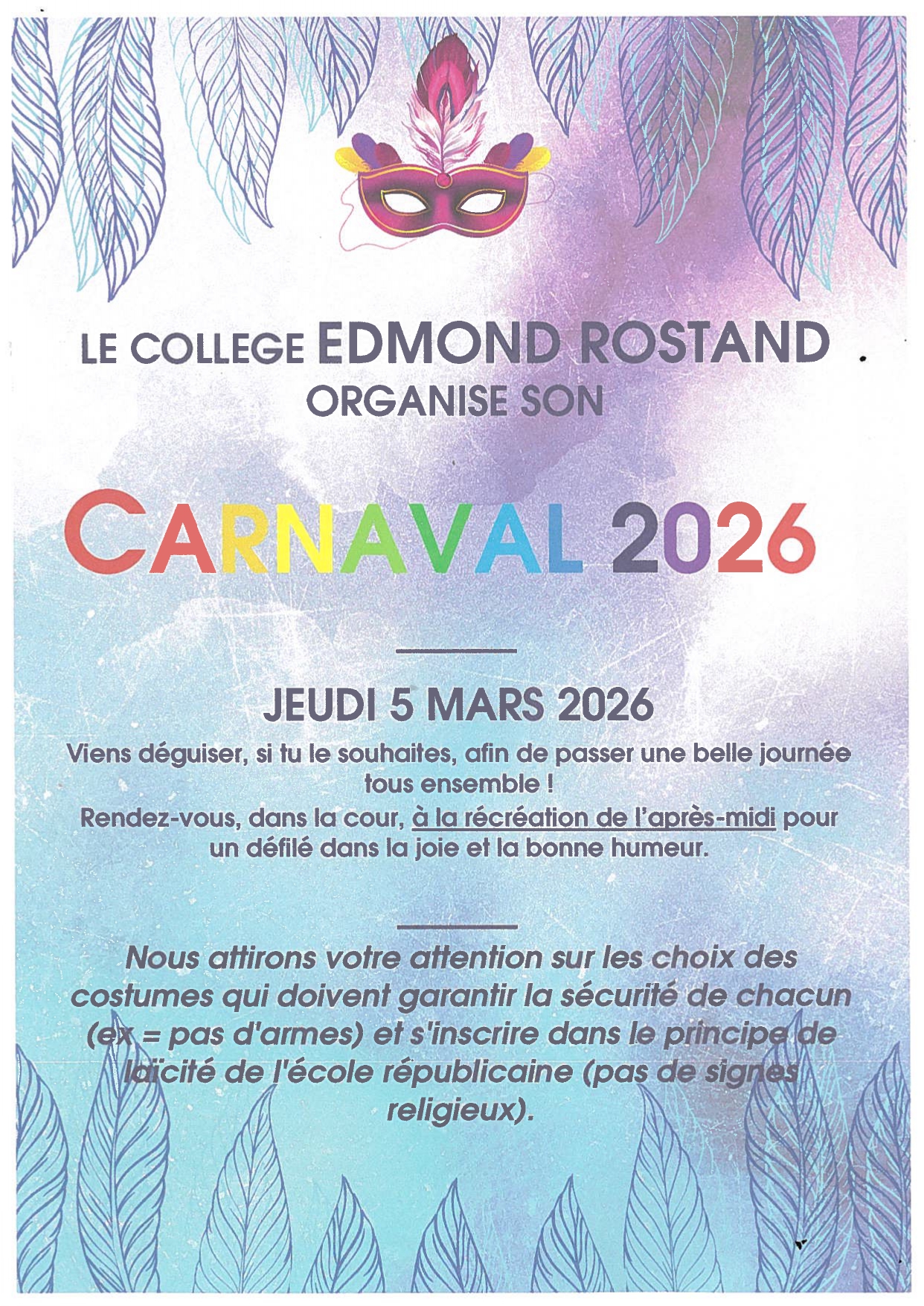 Le jeudi 5 mars 2026, le Collège Edmond Rostand organise son traditionnel Carnaval. Les élèves sont invités à venir déguisés afin de partager une belle journée placée sous le signe de la bonne humeur et de la convivialité.